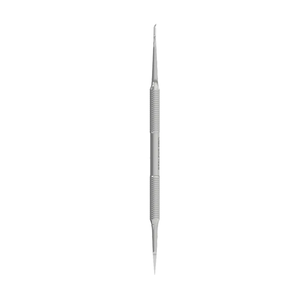 Staleks Double–sided professional Ingrown Toenail tool File helps to painlessly treat an ingrown toenail. Recommended for professional podiatry and podology uses. One end is a hooked spear and the other end is a thin nozzle is a miniature hemisphere.